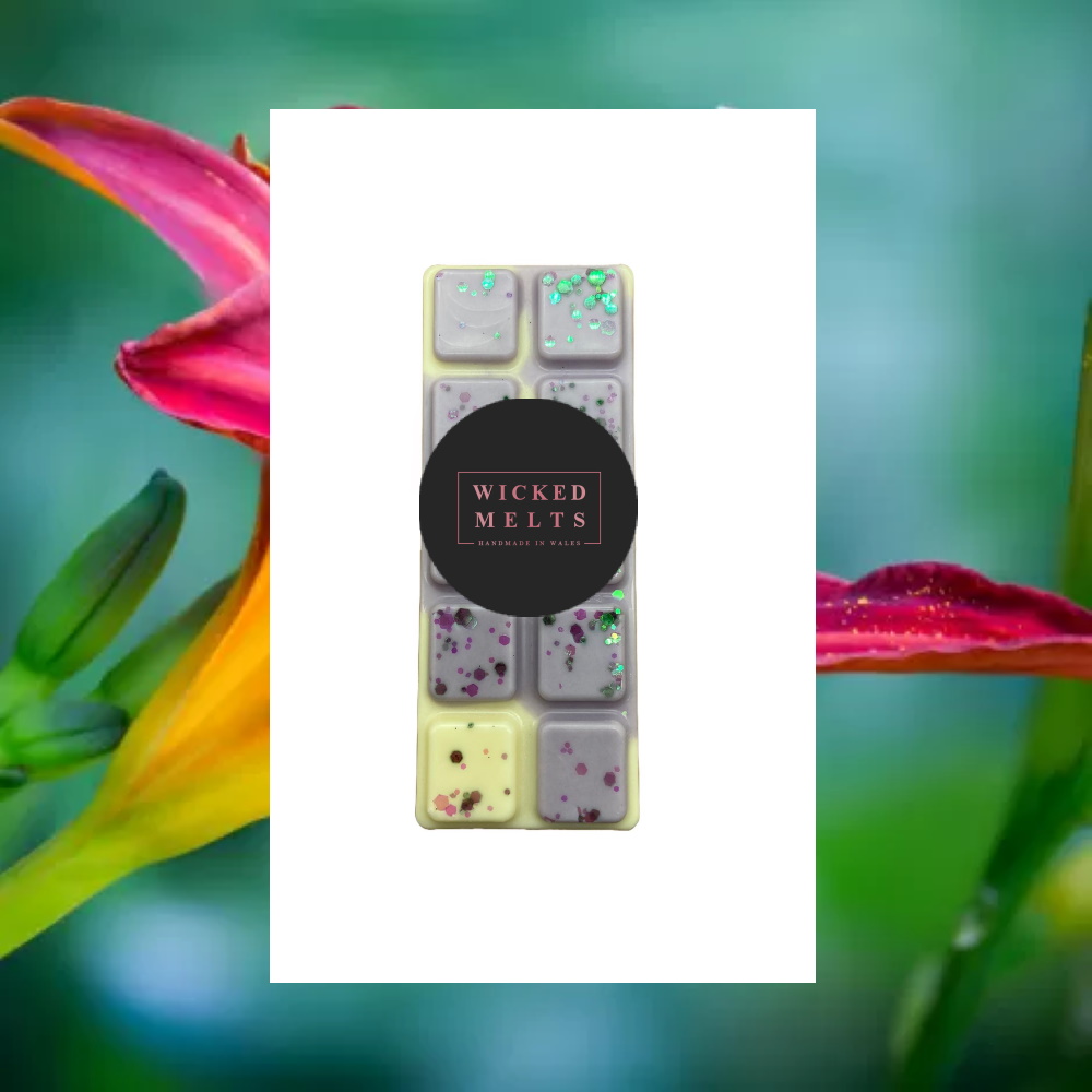 Blooming Exotic Wax Melt 50g snap bar – This fragrance is floral, fruity and oriental with sweet orange, fresh jasmine and musky amber.