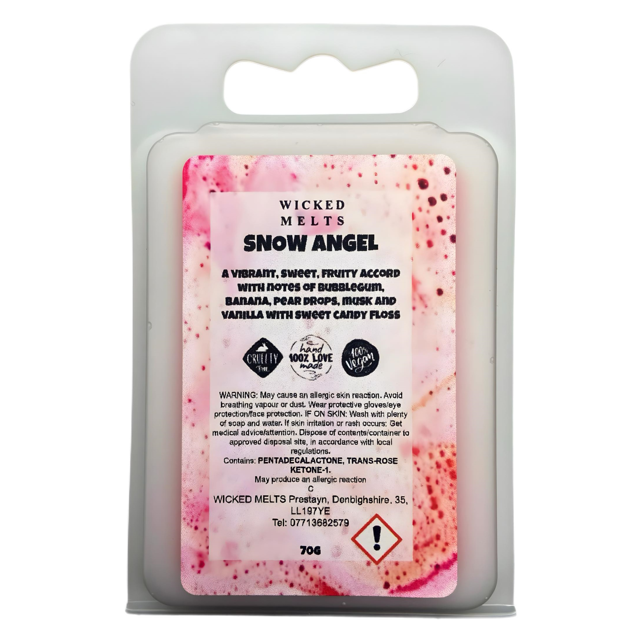 Snow Angel Wax Melt 75g – A vibrant, sweet, fruity accord with notes of bubblegum, banana, pear drops, musk and vanilla with sweet candy floss.